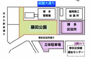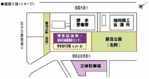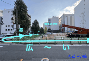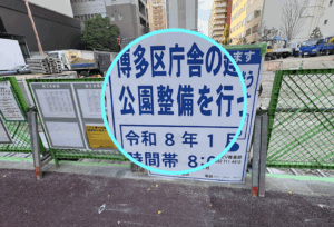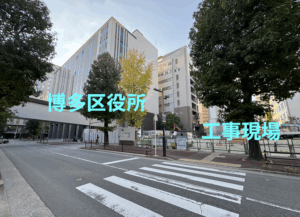 そんな先程の工事現場は博多区役所の真横(以前とは配置が逆:以前は左手に公園、今回は右手に工事現場)。⬇︎