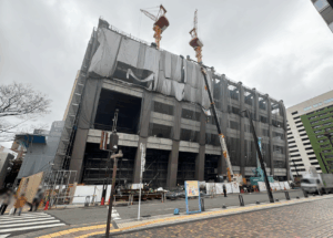 すぐ先の新イムズさんビルの斜め柱は順調に渡辺通り沿いまで伸びていました。⬇︎