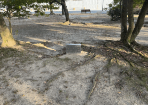 この石柱の後ろが桃の木で、以前は設営地に植っていたんでしょう。