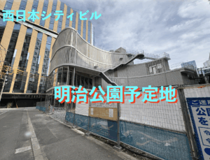 まだ内部には入れないでしょうから周囲をと思ったら・・すぐ隣で整備中の明治公園が・・。⬇︎