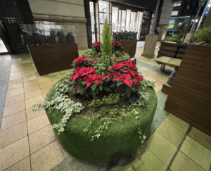 通りに点在するように配置された深紅の花。⬇︎