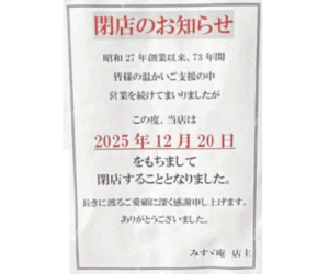本年12月20日をもって、昭和27年の創業以来73年間続いた営業を終えられるようです・・。