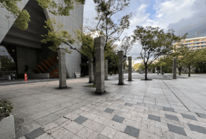 直立する柱と三角形のアクロスさん入り口。⬇︎