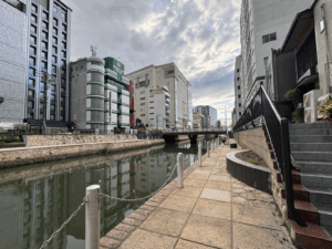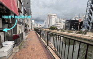 そのまま福博であい橋を抜けて、明治橋から川端通り商店街へ向かうのも芸が無いかと笑、商店側裏の川沿いへ。⬇︎