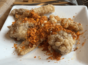 鶏皮揚げにかかった魔法の粉様香辛料?が・・・お皿に散らばったこの赤い粉物を指にくっつけておつまみがわりにしていたのは・・何を隠さなくても僕です笑。