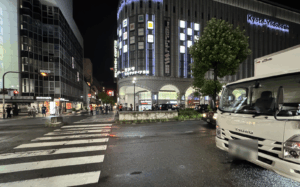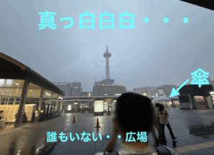 時間は18時45分(点火開始約100分前)の駅前は大雨(凄まじい雨量笑)。
