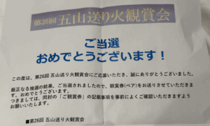 後ろに並んでいたひと回り年上のご夫婦と話しましたが(お嬢さんがくじを当ててくれたと)、こんな時に見えない送り火見学もいとおかしですね・・なんて笑。