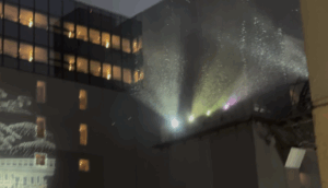 ライトアップに照らされる白いカーテンは土砂降り雨のカーテン・・、しきりにゴロゴロ雷鳴も苦笑。