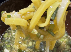 途中で胡麻を少々入れ、締めで紅しょうがまで。