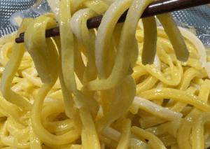 麺をよく観察すると、黄色の全面麺と半分黄麺が4:1の比率(要はほぼ黄色麺)。