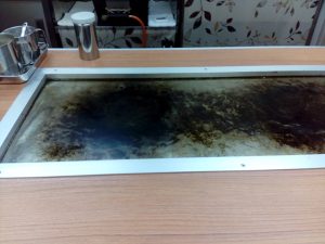 写真左上にもやっとした湯気?・・熱々プレート皿から舞い上がる熱い蒸気で、お皿は触れません笑。