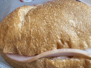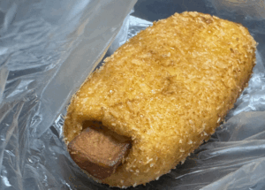 カレー風味の魚肉ソーセージ揚げパン・・。⬇︎