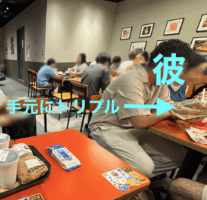 トリプルワッパーはさすがに食べれないな〜なんて話していたら、お隣の外国の?彼が食べてました笑。⬇︎
