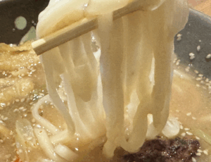 こちらは絶妙なコシを感じる麺で、讃岐風のコシ強でも博多風のコシ控えめ風でも、はたまた裏打ち会風とも少し異なる絶妙仕上げです(表現力が乏しくこれが限界の表現苦笑)。