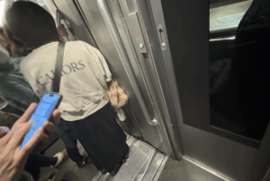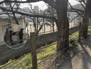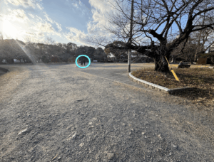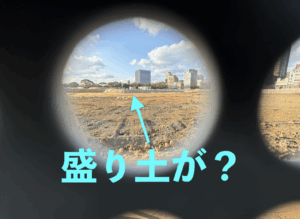 囲いの小さな丸から見える整備中の公園。⬇︎