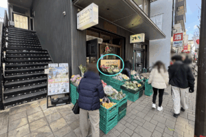 おしゃれな雰囲気のこちらには沢山の野菜が並んでいて、店頭にはやさいたべなさいと笑。