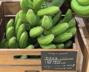 以前は黄色くなった房ごとバナナを見かけましたが(別のお店にて)、青々しいものは初めて。⬇︎