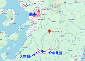 五家荘地域とやまえ堂本店と人吉駅の位置関係を。⬇︎