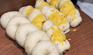 ベーグル生地でソーセージを巻いてチーズ掛け・・、食べてみるしかありません笑。