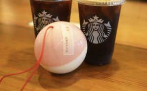 この緑の前掛けから推測するに・・、そうです『スターバックス京都(の数店舗限定)』さんでのみ販売されている『福玉』に入った幸運を招く縁起物チャームのようです。