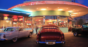 旧いアメ車とキラキラネオンが眩しいハンバーガースタンドがあるテーマパークといえば・・『USJ』ですね。