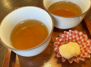 温かいほうじ茶とクッキーをおかみさんらしき女性が持ってきてくれました。